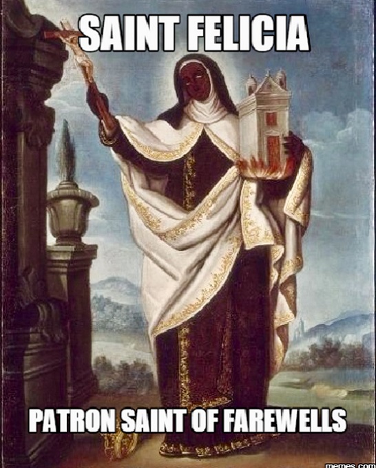 Well Now, Always Remember, Superdavebeastula The Tall White Gothic Vampire Alien, Coming To You from Laval Quebec Canada. So. It Seems to Me that we have a female saint over here. My Digital Host, David, and I have seen the expression Bye Felicia written to someone who was Being an SJWCentral person. We wondered about the significance of this statement. We didn't get a grasp of this meaning until a friend on Facebook told us about it. It originally came from a movie where this girl or woman named Felicia was talking too much and the man told her that statement. It has now become a meme for people, especially those of Social Justice genre. Perhaps this saint is one of those that you have to say bye to. Thankyouverymuch. ππππππ