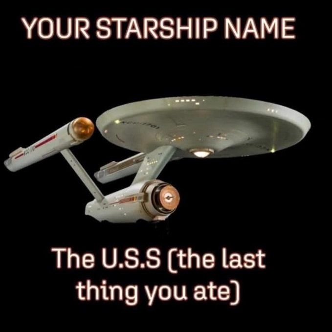 Well Now, Always Remember, Superdavebeastula The Tall White Gothic Vampire Alien, Coming To You from Laval Quebec Canada. So. It Seems to Me that at some point, since I met my Digital Host, David, I have made changes to the ship. Now, we are flying around in something that resembles the USS Enterprise. Since that name is already owned by Captain Kirk, we have decided upon another. We were Brainstorming some ideas as to what we can christen the name into when, David, came up with a Grand Slam of an idea. Out Starship Name is the USS followed by something we last ate. I will let my host decide what our ship is called. Thankyouverymuch. ๐๐๐๐๐๐