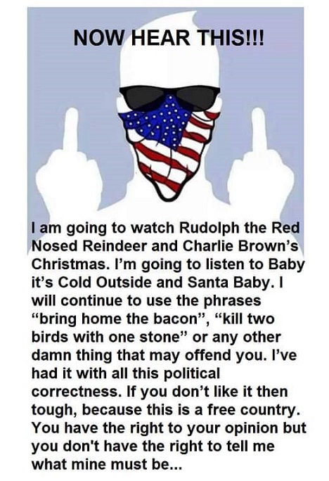 Well Now, Always Remember, Superdavebeastula The Tal White Gothic Vampire Alien, Coming To You from Laval Quebec Canada. So. It Seems to Me that it is Almost Christmas. The Yuletide season is going to be upon us. So now this is the message that my Digital Host, David, and I have to give. We will watch Rudolph the Red-Nosed Reindeer and Charlie Brown's Christmas. We also listen to Baby It's Cold Outside and Santa Baby. We will use phrases like Bring Home the Bacon, Kill Two Birds With One Stone or anything else that would offend the Social Justice Warriors. If you are one of theses SJWs, we pity you, but we will NOT abide with Political Correctness. Also we say Tough Luck to you because we live in a free society. You have your own right to your opinion but you do NOT dictate what ours is. It also means you do NOT tell us what we can or cannot say. Thankyouverymuch. ๐๐๐๐๐๐๐