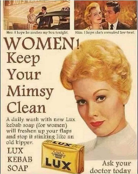 Well Now, Always Remember, Superdavebeastula The Tall White Gothic Vampire Alien, Coming To You from Laval Quebec Canada. So. It Seems to Me that my Digital Host, David, and I have found an old ad. Mind you, we haven't checked if it is Authentic or if this is just parody. In any which case this picture talks about LUX Kebab Soap. Apparently, this soap is for the female anatomy, to keep it smelling nice and clean. It says that a daily wash with this soap will freshen up your flaps and stop it from stinking like an old kipper. Thankyouverymuch. 😀😃😄😁😆😅😂🤣😍🥰😇😈🧼🫧🌷🐟