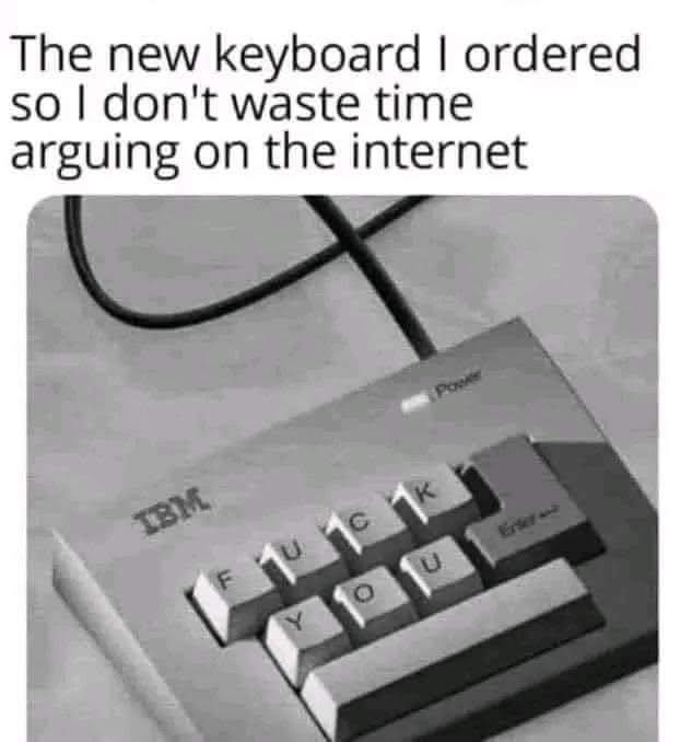 Well Now, Always Remember, Superdavebeastula The Tall White Gothic Vampire Alien, Coming To You from Laval Quebec Canada. So. It Seems to Me that we have a photo of a particular Keyboard. My Digital Host, David, copied this from one his Facebook friends of his. We are not sure if this is actually real or fake, but it sure is Hilarious. Apparently, a person ordered this item so that no time is wasted arguing on The Internet. We would understand completely since we had TOO Many encounters with Social Justice Warriors. It is so simple, even a bleach blondie bimbo would be able to understand it's One Function. It starts with the F word and ends with U. Thankyouverymuch. ๐๐๐๐๐๐๐