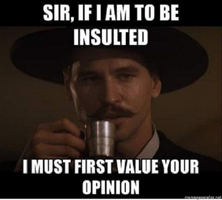 Well Now, Always Remember, Superdavebeastula The Tall White Gothic Vampire Alien, Coming To You from Laval Quebec Canada. So. It Seems to Me that those who belong to the SJWCentral are trying to insult us. My Digital Host, David, have been called Hillbillies, Rednecks, Rightwing Fascists, ETC. Well, Doc Holliday, from Tombstone played by the late Val Kilmer, has the best response. That phrase is, Sir, If I Am To Be Insulted, I Must First Value Your Opinion. That says it all. Thankyouverymuch. ๐๐๐๐๐๐