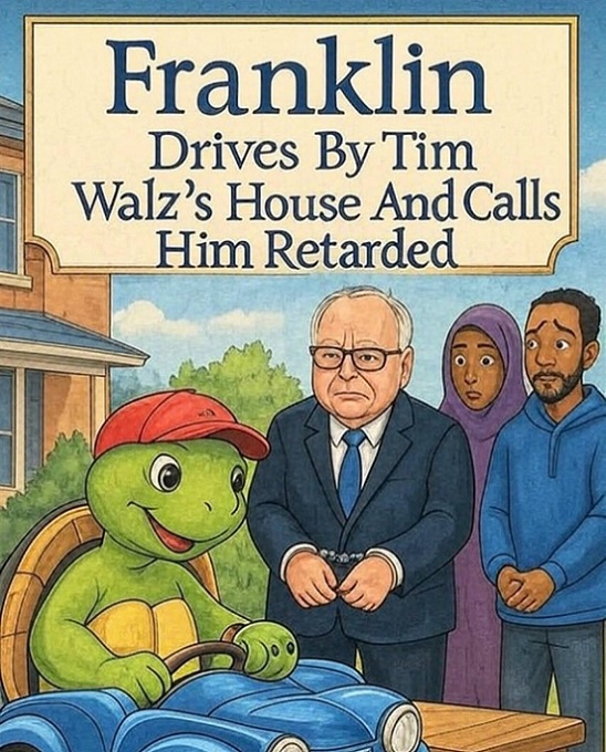 Well Now, Always Remember, Superdavebeastula The Tall White Gothic Vampire Alien, Coming To You from Laval Quebec Canada. So, It Seems to Me that we have a little storybook of Franklin the turtle. He is driving by Tim Walz and two Sonali Illegal Aliens. The governor of Minnesota is in handcuffs, getting arrested while the other two will be deported. He looks indignant because he is being called a Retard while the other two are worried about their deportation. My Digital Host Host, David, and I say that this photo is perfect in its Glory Glory. Thankyouverymuch. ๐๐๐๐๐๐