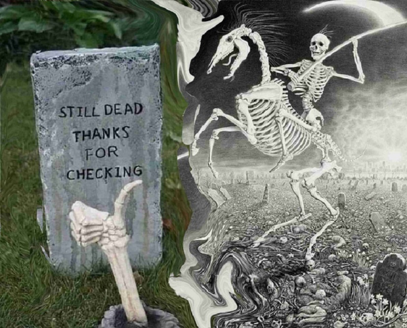 Well Now, Always Remember, Superdavebeastula The Tall White Gothic Vampire Alien, Coming To You from Laval, Quebec, Canada. So It Seems to Me that we have a checkup going on. The Reaper, after he (or maybe she) collects the souls of the Dead, he goes back to the Cemetery. This entity makes a quick scan about the place, making sure that the bodies are still buried. If there are any Ghosts, Goblins, Zombies, Vampires or any other Undead Cryptids walking about, they are whisked back to their resting place. My Digital Host, David, and I see that most of the dead stick out their arms and give a Thumbs Up. They say Still Dead Thanks For Checking. Thankyouverymuch. ๐๐๐๐ฅฐ๐๐๐ป๐โ ๏ธ๐๐ค๐งโโ๏ธ๐งโโ๏ธโฐ๏ธโฑ๏ธ๐ชฆ