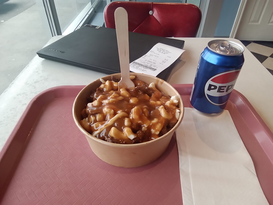 Well Now, Always Remember, Superdavebeastula The Tall White Gothic Vampire Alien, Coming To You from Laval Quebec Canada. So. It Seems to Me that we have a meal over here that is of Quebecois design. My Digital Host, David, were in the area of Montrรฉal-Nord getting the Subaru Outback fixed up. We basically had the exhaust pipe system replaced on our vehicle. Afterwards we were slightly famished and needed to pig out on something. So we came over to a little Restaurant on Saint-Michel Boulevard called Peskero ordered ourselves a Poutine. That in itself is basically, Fries, Cheese Curds and Gravy. We ordered the Steak Poutine and as you may have guessed, the steak is the one they put into submarine sandwiches. Accompanied with it as you can see in the picture is a can of Pepsi Cola. I think we ordered a second can, since we like to drink pop. At any rate we were as happy as a cute piggy Lulu in the mud. Thankyouverymuch. ๐๐๐๐ฅฐ๐๐๐๐๐๐๐ฅค๐ท๐ฝ๐